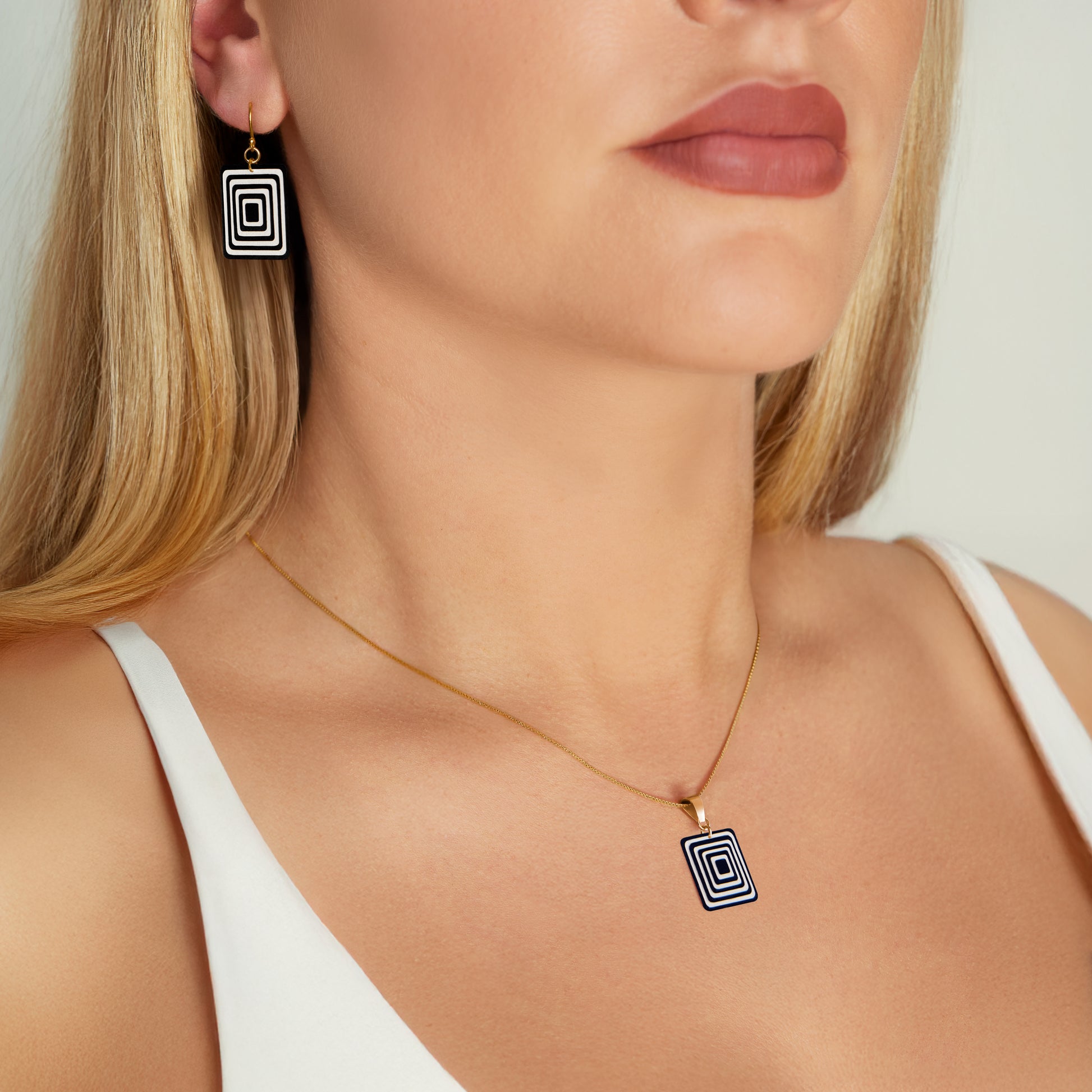 Eco-Friendly Black & Pearlescent White Earring & Necklace Set with a gold plated 18k sterling silver 925 17-inch chain and french hooks, both nickel-free and gentle on sensitive skin. Designed to be double-sided, both the necklace and earrings look effortlessly elegant from every angle.